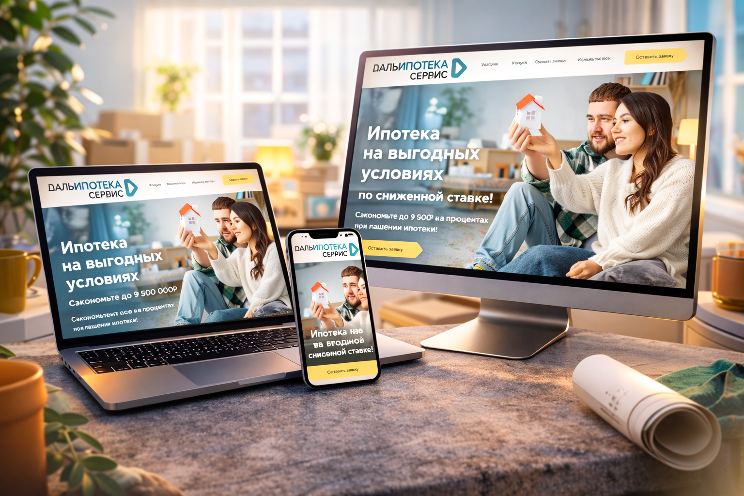 Теплый свет гостиной, мягкий свитер, миниатюрный домик в руках — все на Dalipoteka.ru сложено как сценарий мечты, где каждый элемент работает на ощущение достижения. Мужчина и женщина — не модели, а пара, погруженная в момент принятия решения: их взгляды, жесты, улыбки — живые триггеры эмоционального доверия. Лучшие сайты для бизнеса раскрывают, как визуальные детали влияют на восприятие цены. Заголовок «Ипотека на выгодных условиях по сниженной ставке!» — выстроен как финансовый манифест: четко, с акцентом на цифру 9 500 000₽ — будто подсчет сэкономленных рублей, переведенный в язык желания.