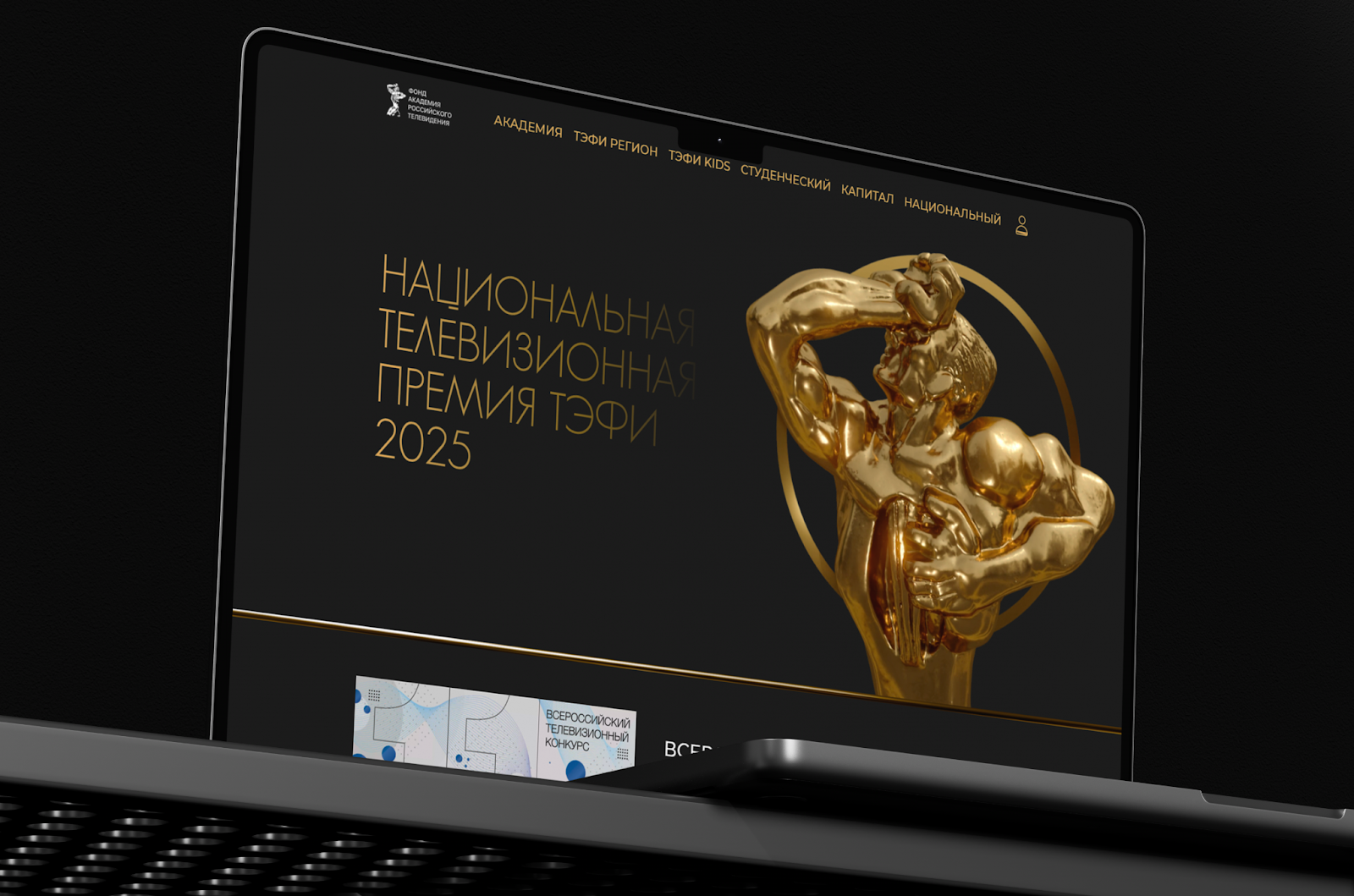• В центре внимания — сияющая золотом статуэтка премии ТЭФИ — символ признания и профессионального триумфа.
